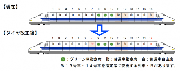 N700Aタイプ統一により全席禁煙になるのに合わせ、こだまの7号車を指定席(現・自由席)に、16号車を自由席(現・指定席)に変更となります。